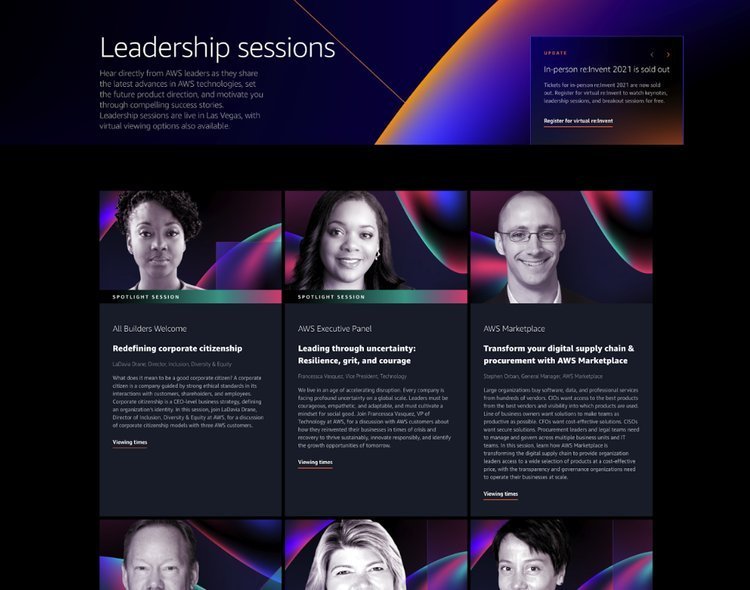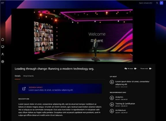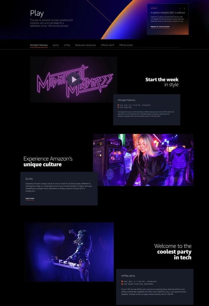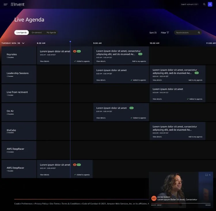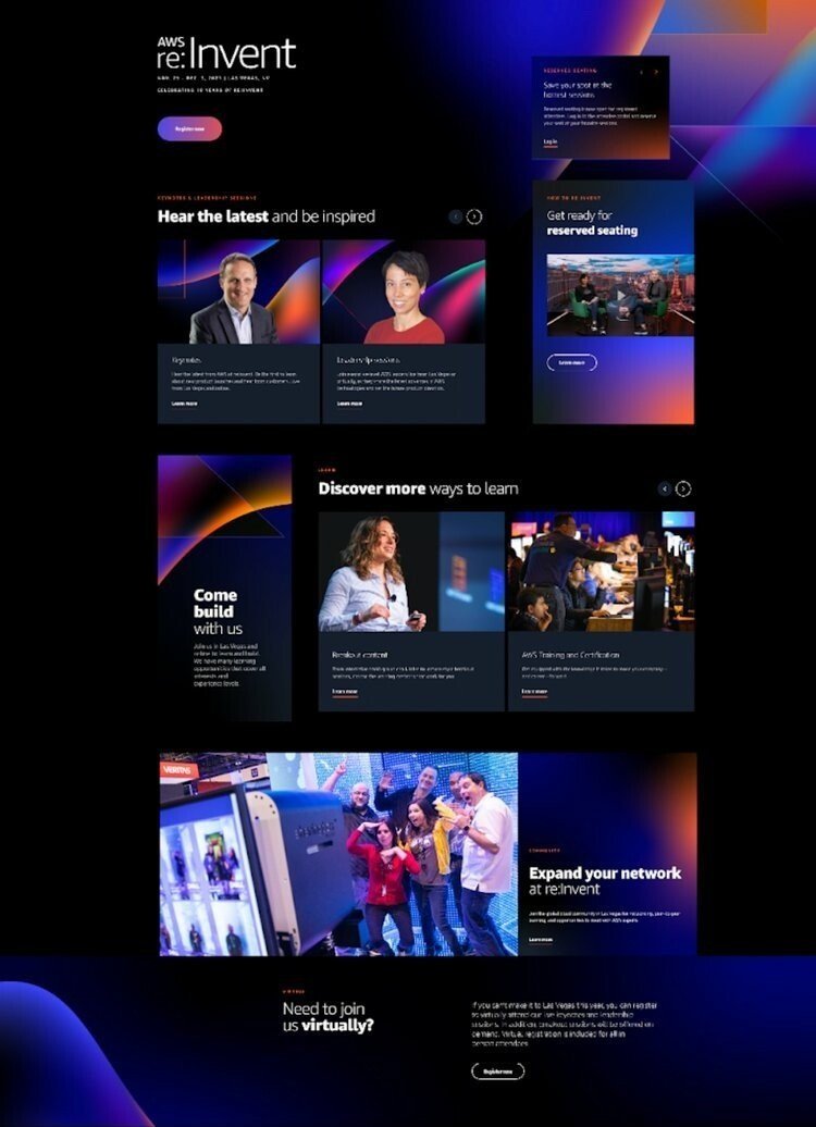 re:Invent is a learning conference hosted by AWS. The event features bootcamps, gamified learning, hundreds of technical sessions and keynotes presented by industry leaders. With over 50,000 attendees coming from around the world, it was important to get visitors excited whether attending in-person or online through the virtual platform. The team achieved this by introducing new branding while maintaining visual and messaging consistency through all channels.